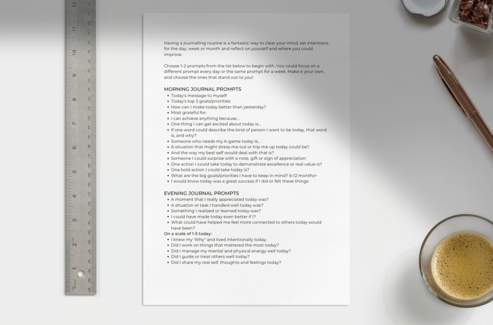 Downloadable PDF, morning and evening journal prompts, weekly and monthly reflection prompts