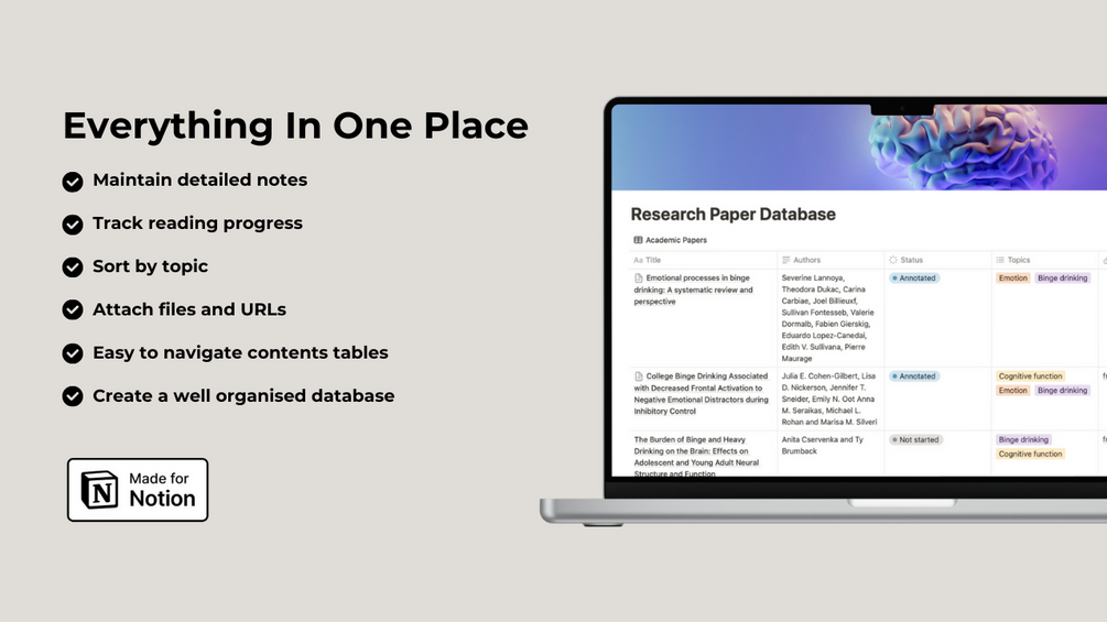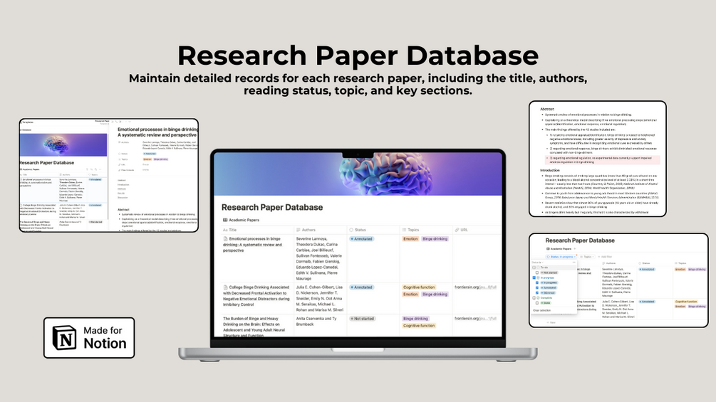Streamline your academic journey with our Research Paper Database template for Notion! Designed specifically for early researchers and students, this intuitive tool helps you efficiently manage and keep track of the research papers you're reading, allowing you to focus on what truly matters—your research.